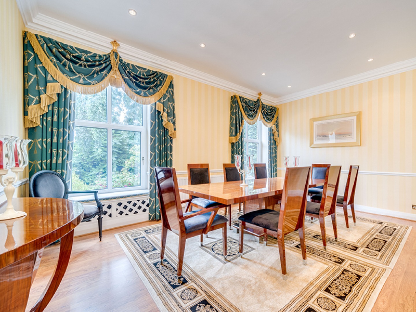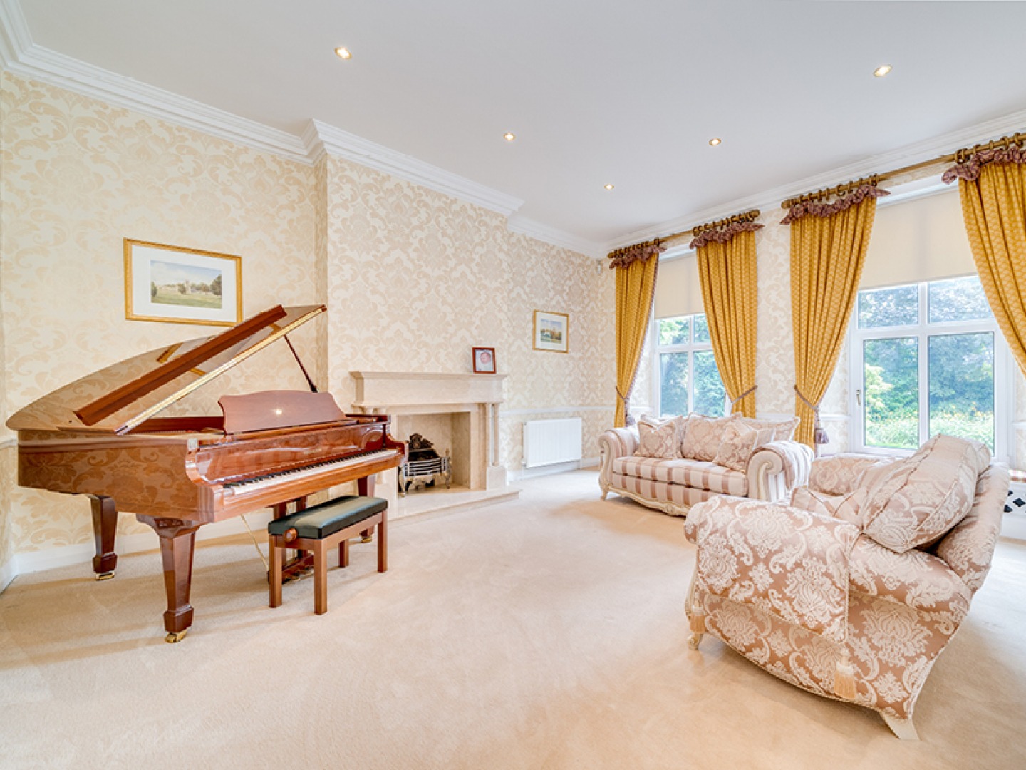 Spacious living accommodation is arranged over three levels and briefly comprises a central reception hall with sweeping staircase to the first floor, formal lounge, sitting room, study, elegant dining room and wine cellar. A magnificent bespoke kitchen/breakfast room leads to an open-plan garden room with stunning apex ceiling and French doors to the private rear patio and garden.