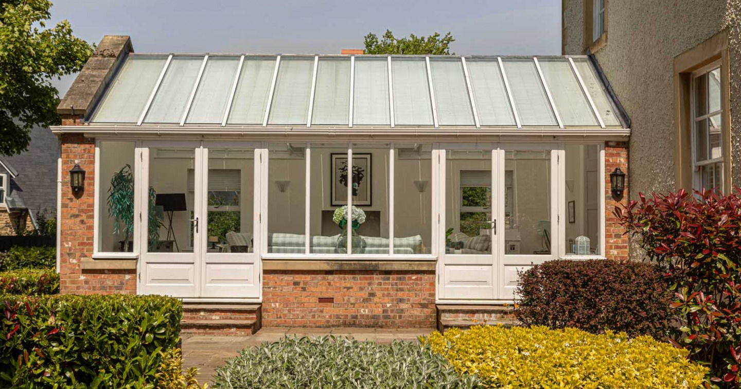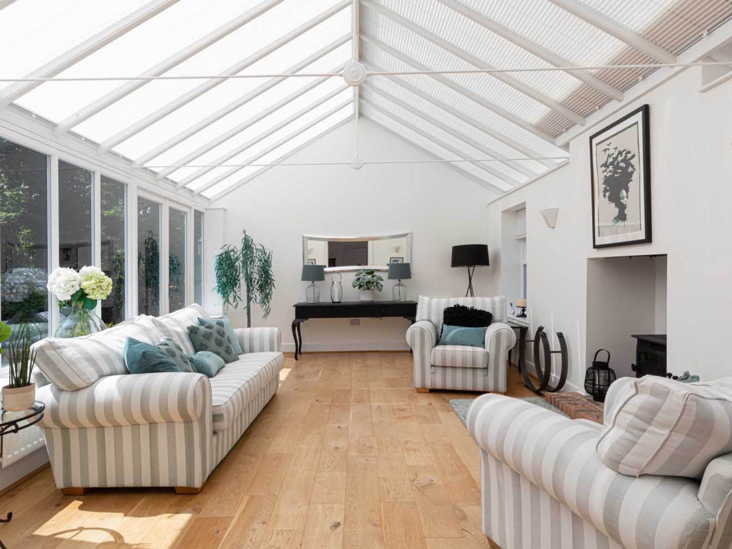 The impressive entrance hall runs the length of the house. From here, double doors lead into the lounge, as well as into a second reception room which can be used as an office. Both rooms feature open fireplaces, giving a cosy feel. In the open-plan kitchen, a large island is the centrepiece – the kitchen also features a range-style cooker and integrated appliances including a built-in coffee machine and a wine cooler. From here, the triple-aspect dining area with outdoor patio access makes for a perfect entertaining space. A utility room is accessible from the kitchen, and also on the ground floor is a cloakroom with WC. There is an additional third reception room which opens into the stunning garden room, offering splendid views across the extensive gardens.