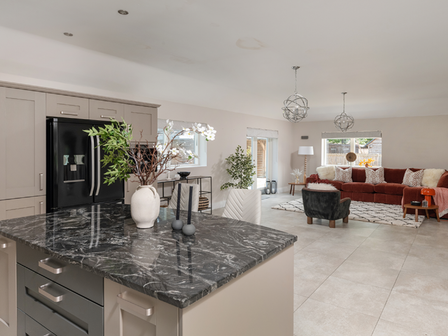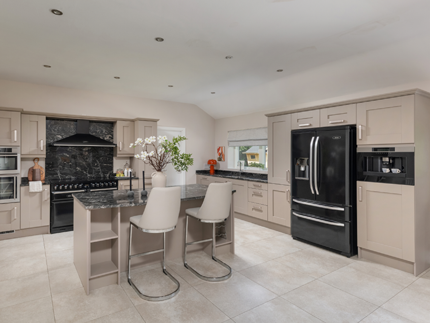 The large kitchen, breakfasting and family room boast pretty views overlooking the gardens and the kitchen is fitted with a range of modern cabinets and built-in appliances, a central island, and granite worktops. The dining room has access into the sitting room and kitchen.