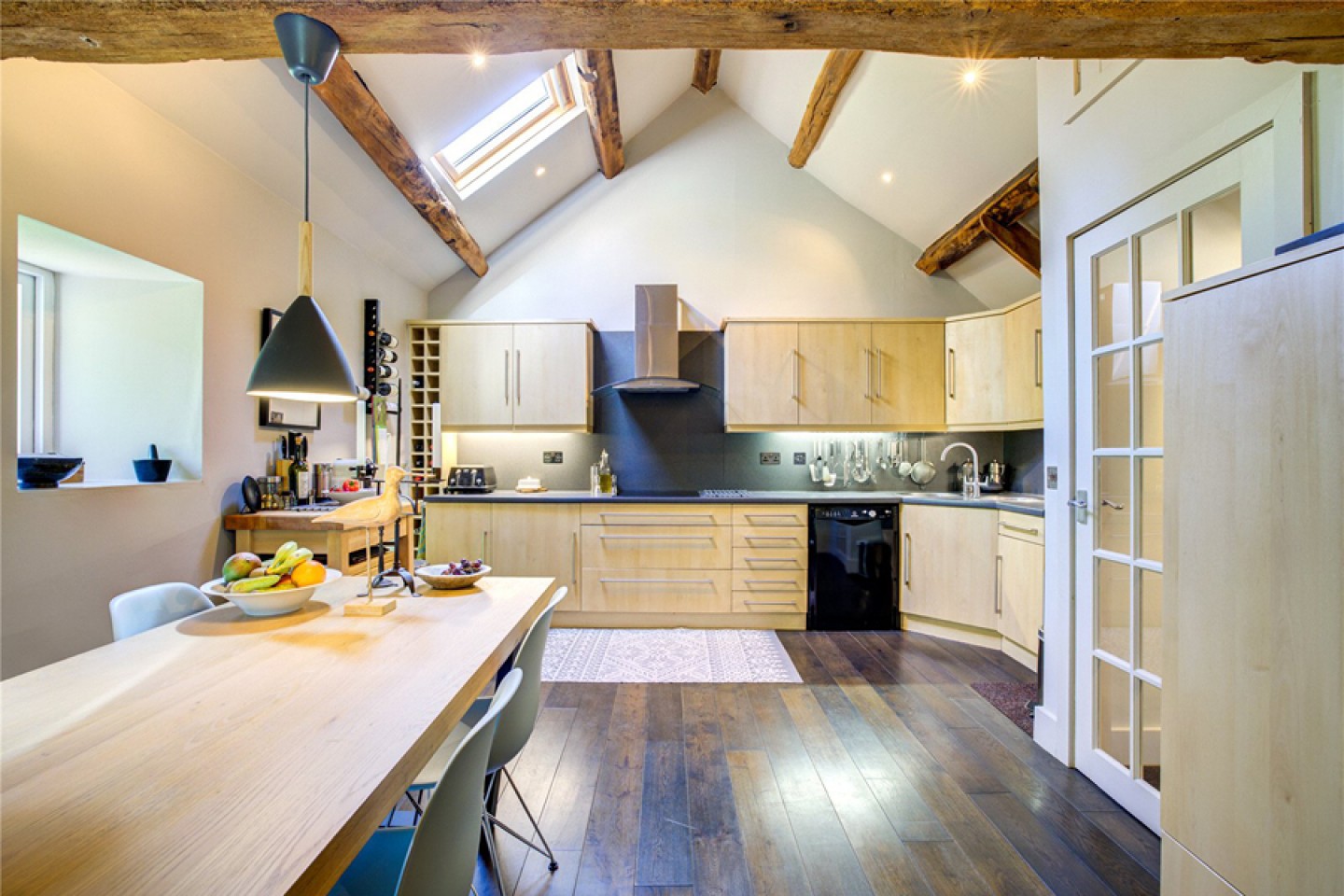 The impressive kitchen-diner has original beams, vaulted ceilings, and integrated appliances. The dining area flows through to the living room via double doors, making it ideal for entertaining. A charming arched stone doorway connects to the dining landing area, where there’s a striking vaulted ceiling.