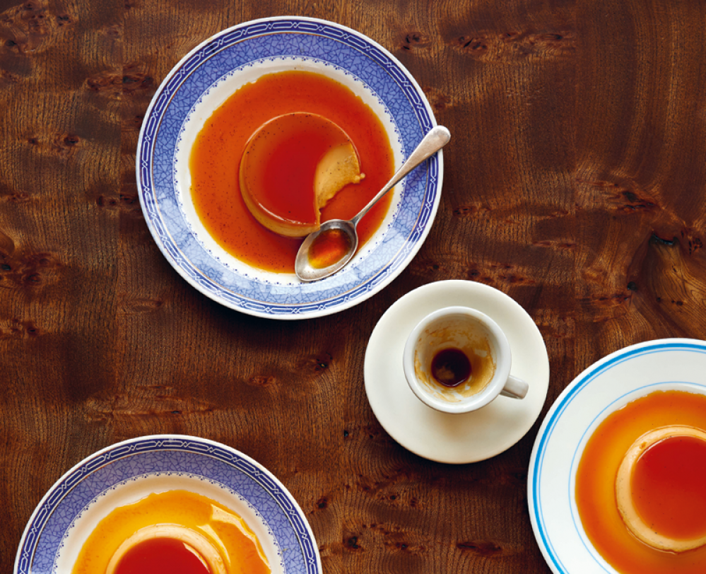 Start by making caramel. Have a bowl (or sink) of cold water to hand. Put 100g of the sugar in a heavy-based saucepan in an even layer. Add the measured hot water and allow the sugar to absorb it for a few minutes, then set over a medium heat and leave to dissolve. You can help it along by shaking the pan, but do not stir. Once a syrup forms, it will turn golden and then to a rich caramel colour. To stop the cooking, place the base of the pan in the bowl (or sink) of cold water. Divide it between four ramekins, each nine by five centimetres, then place in a roasting tin.