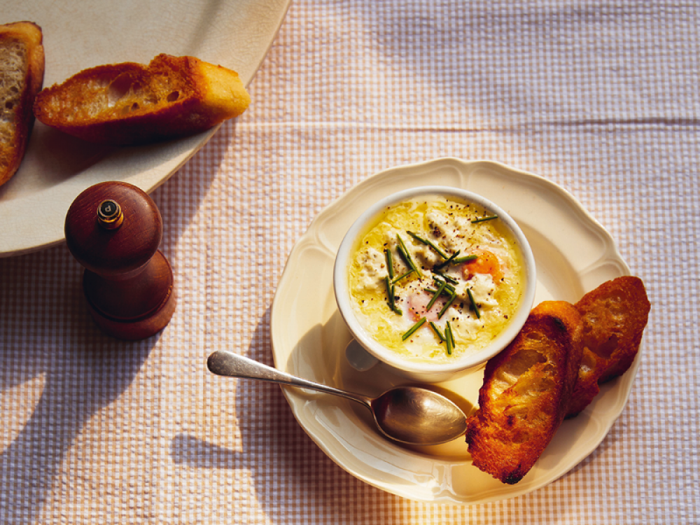 When the eggs are cooked, the whites will be completely opaque. Give the yolks a gentle poke; they should be soft to the touch and the overall dish should have a satisfying wobble to it when shook. Finish with salt flakes, cracked black pepper and chopped chives. Serve with toasted sourdough soldiers if you want to keep things healthy, but I’d recommend the butter-fried baguette route every time!