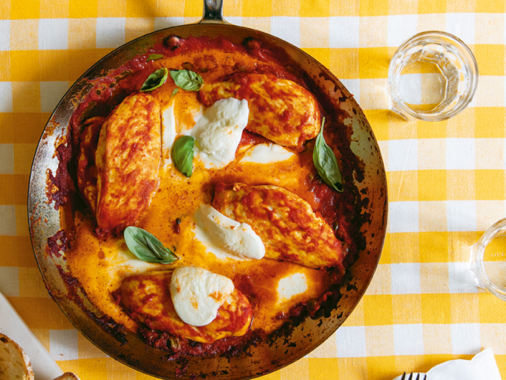 While chicken breast is undoubtedly an easy, quick and uncontroversial option for supper, I find it often to be quite disappointing: a little bland, usually dry and just a bit boring. Except when cooked this way: the meat is browned, then lightly poached in rich tomato sauce so it stays exquisitely tender, and each piece comes enrobed in a blanket of melting mozzarella cheese. Absolutely essential with this is some crusty bread for wiping up all the juices on your plate. And depending on your mood, you might also want a light salad or a few greens.