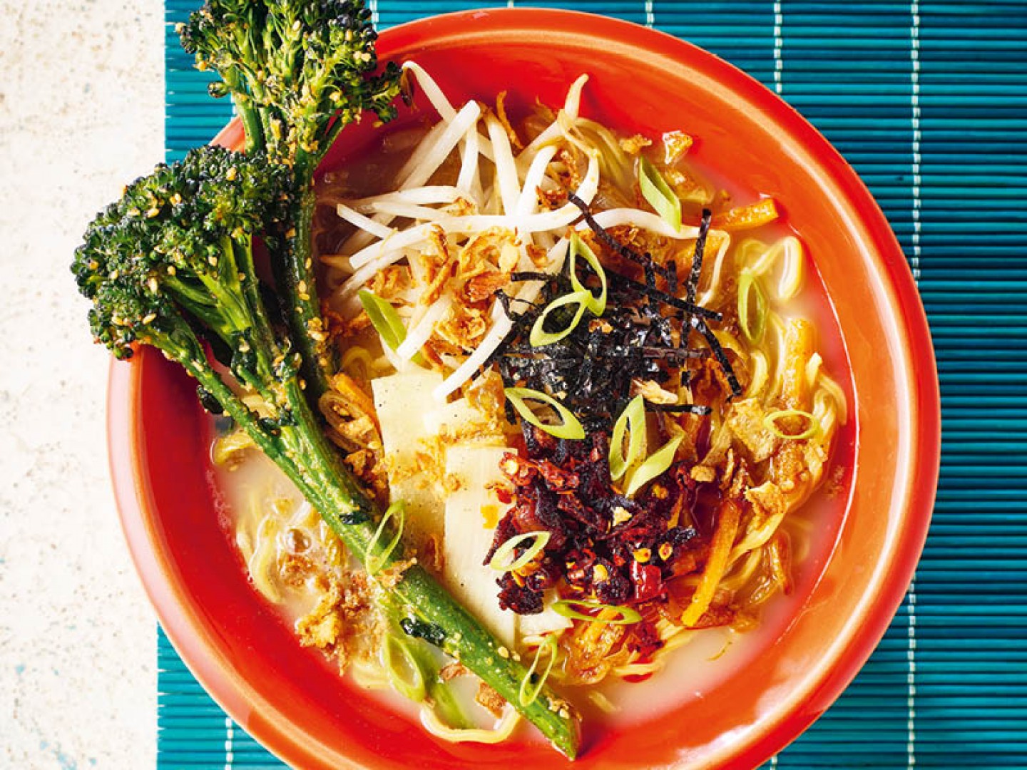 This vegan dish showcases the colour and texture of garden and sea vegetables with the added umami depth of seaweed, miso and soy. Crispy dried onions are a great store-cupboard ingredient and add a final, tangy, crunchy topping.
