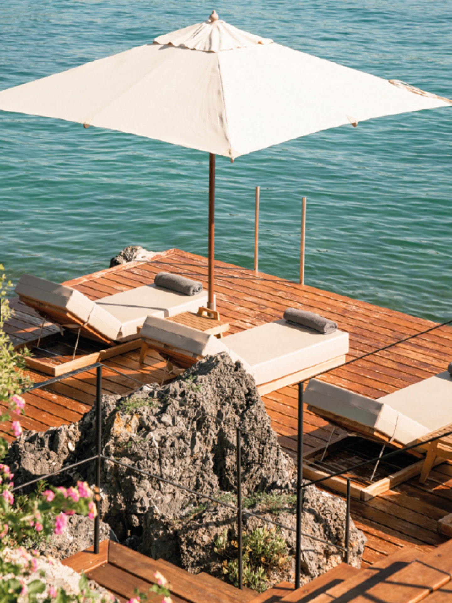 Steps lead from our gated garden to a private cove and curving wooden boardwalk which connects the resort, winding its way through beach platforms, pontoons, and out towards a headland, where watersports – in the form of paddle boards and kayaks – call for summer days spent at sea.