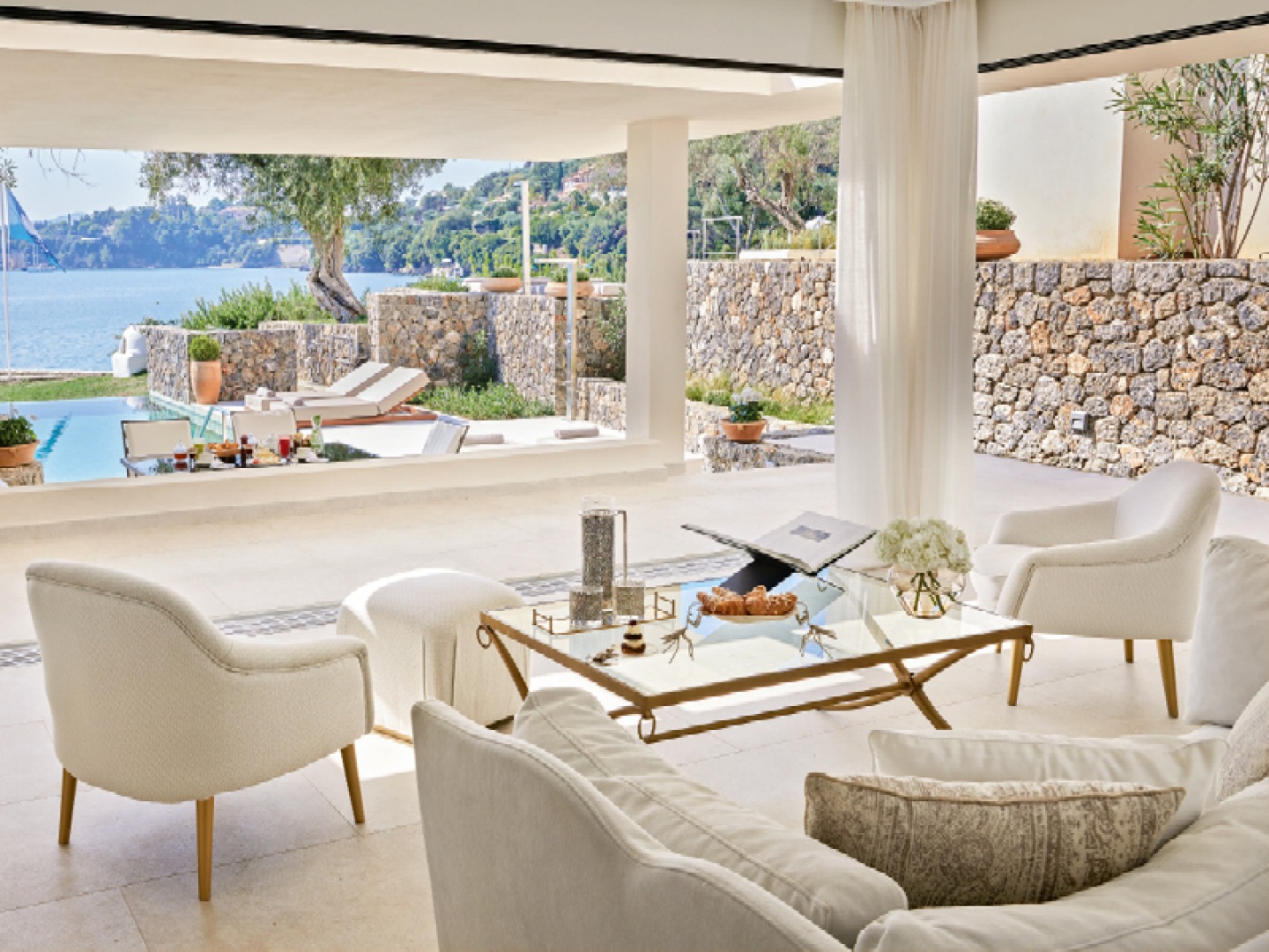 Morning arrives and given the thread count and unspoilt views across Kommeno Bay, a coffee in bed seems all too tempting, but we opt to check out the fitness suite instead. It’s a welcome rarity to find a hotel gym of this standard; quiet and well thought out, with first-rate cardio equipment and ample floor space for morning pilates (there’s the option for semi-personal and private PT classes, too). We’d like to say that we began every day in such a virtuous manner… but there might have been one occasion where the siren call of another thimble of tart kumquat liqueur (a traditional Corfiot digestif) put paid to our plans. We were on holiday, after all.